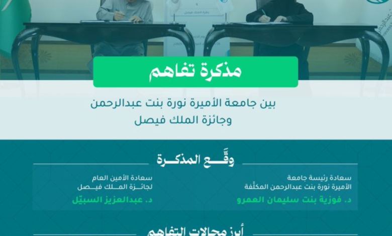 عدة مجالات.. مذكرة تفاهم بين جامعة الأميرة نورة وجائزة الملك فيصل