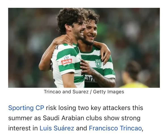 هذا التحذير وجهته صحيفة «أبولا» البرتغالية إلى سبورتنغ لشبونة بعنوان «انتبه! سواريز وترينكاو في طريقهما إلى المملكة العربية السعودية»، إذ نال لويس خافيير سواريز وفرانشيسكو ترينكاو، اهتماماً كبيراً من قِبل أندية دوري روشن، التي تستعد لتقديم عروض مغرية في الصيف القادم، الأمر الذي يعيد ذكريات مؤلمة إلى بطل البرتغال ليست ببعيدة على الإطلاق.