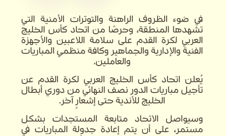 Mohammed Mubarak Al-Mahmoud, the General Director of the organizing committee, confirmed that the decision is a precautionary measure in light of the current developments, noting that the safety of the participating delegates and preparing conditions suitable for holding the tournament remain the top priorities of the organizing committee.